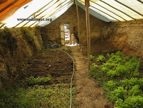 The Walipini, in simplest terms, is a rectangular hole in the ground 6 ‛ to 8’ deep covered by plastic sheeting. The longest area of the rectangle faces the winter sun — to the north in the Southern Hemisphere and to the south in the Northern Hemisphere. A thick wall of rammed earth at the back of the building and a much lower wall at the front provide the needed angle for the plastic sheet roof. This roof seals the hole, provides an insulating airspace between the two layers of plastic (a sheet on the top and another on the bottom of the roof/poles) and allows the sun’s rays to penetrate creating a warm, stable environment for plant growth.