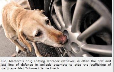 Appropriately named Kilo, the Medford Police Department’s drug-sniffing Labrador retriever is often the first line of defense in law enforcement’s attempts to stem the trafficking of marijuana tied to the OMMP.