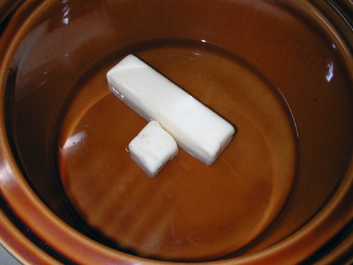 Use your crock-pot; start off on high (@300 degrees F) with 2 cups of water per stick and 1/3 of butter. This will yield about a stick or a bit more (1/2 cup) because some is lost during the filtering process.