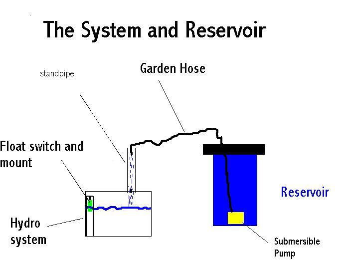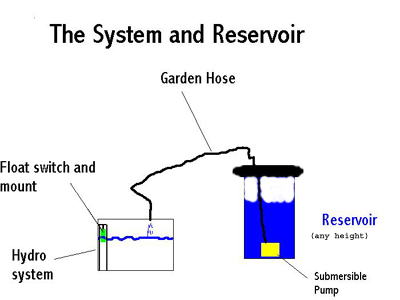 Here’s what the whole setup looks like. Note that the reservoir can be placed anywhere, but to avoid the problem of water continuing to siphon out of the reservoir and into your system after the pump shuts off, make sure the water is being pushed up to your system. That is, make sure the outlet of the hose is above the height of water in the reservoir. [Experiment with this and please get it right, so you won’t blame me for flooding your house/apartment!] A simple way to accomplish this is to allow the incoming water/nutrient to pour into a standpipe of some sort (open on top to the atmosphere) which channels the water into your system. This topping method works fabulously well for me. It allows the reservoir to be far away from my hydro system, on a cool floor in fact, requiring no space in the growroom. The res. can be placed at any height that’s convenient, unlike with gravity fed, float valve topping method.