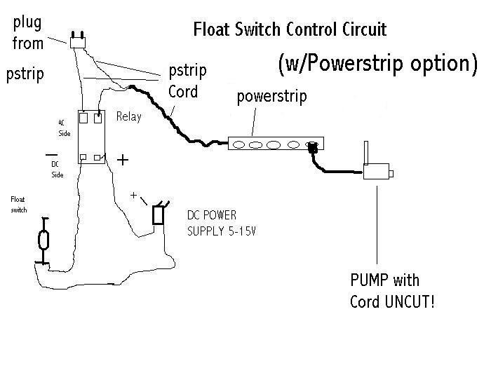 One of the power supply’s wires directly feeds the float switch. Another wire runs between the float switch and the relay(DC side). The last wire connects the relay(DC side) to the other power supply wire. The AC side of the relay connects to the two wires coming from your pump. alternately, you can attach the two wires (power and ground) from a power strip to the relay. This will allow you to plug your pump into the powerstrip sockets, instead of having to strip the wires off your pump.