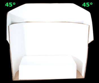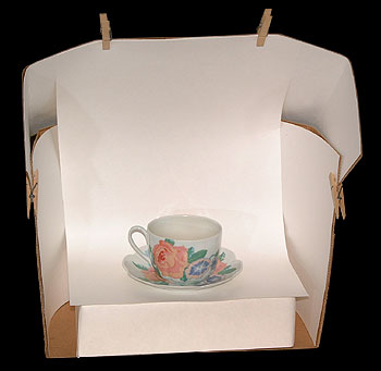 While a plain colored surface can be used underneath and behind the ubject to be photographed, the light will remain strongly directed from the front. A cheap and effective method to reflect and diffuse light is to use a simple box lined with white poster board. The box is placed on white card stock which is sufficiently large so as to hide the background and make it invisible in the frame.