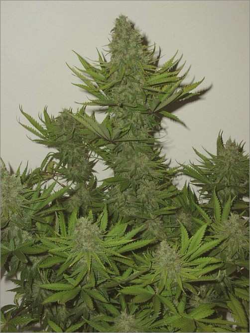 This is a shot of some of the garden at four weeks flowering. This is a very sativa-dominant garden so I’m wrestling with stretching and doing alot of topping, even now. There are two Thai-tanics barely visible on the left with Haze crosses showing as the leggy, fluffy buds plants worked around the perimeter. The only plants that I think will give me thick, heavy colas are my C99 X Peak19 crosses. Their parents produced heavy colas….and are already showing heavy trichome formation. Thai-tanic being as pure of a sativa as you can get with a tad of indica thrown in from the Skunk #1, has a great profile, but man is it leggy. Buds are quite dense for a sativa.