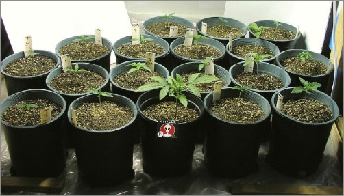 The following photo shows one gallon pots that have been spray painted with two coats of Griffin’s Spin-Out. My current plan is to sex in these pots at around 3 weeks (if growth is good), and then upcan to untreated 3 gallon pots to finish.