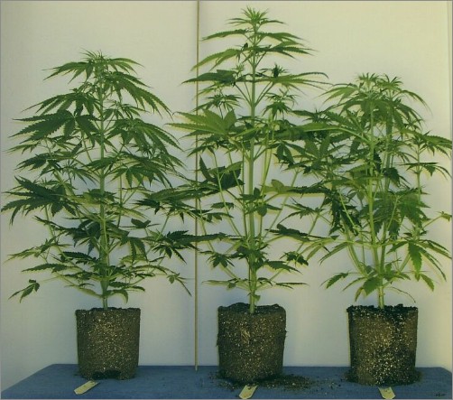 Today I dumped all plants showin’ any nasty lil’ balls after six days at 12/12. Of 18 plants started, nine are female (which REALLY is gonna be a space problem for me!), six are male and three undetermined. The attached photo shows a representative profile for six males that were destroyed. The two on the left are TFD Haze X Peak19, the one on the right being C99 X Peak19. Tallest plant is 27″ (66cm) tall not counting the height of the rootball. Yardstick is in the middle for reference.