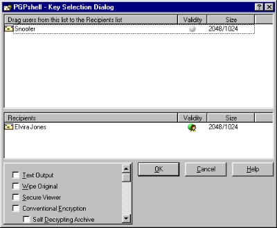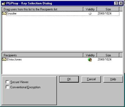 Drag the Public Key of the user you intend to send to down to the bottom pane. If your Key is not already dragged down to the bottom pane, you may want to do so now. If you do not, you will not be able to decrypt it yourself later. Now press OK.