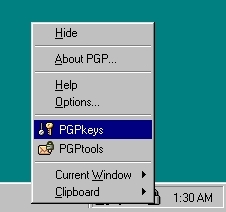 Go to your system tray which is located at the bottom right of your screen. Click on the PGP icon then select PGP KEYS. Note: You can also access PGP KEYS through the start menu. ie:START MENU-PROGRAM FILES-PGP-PGP KEYS