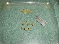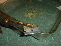 Using another razor blade (or the original collection blade) scrape the clump of oil/bud back and forth between the two blades until it falls loose and into the pile of ground bud. Poke and push the glob around in the ground bud until it is mostly coated and no longer sticks as well to the razor blade.
