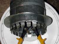 · Place the tab collar in the 4″ hole you drilled in step 1 and fold the tabs back. Repeat for second tab collar. Use a pair of leather work gloves when folding those tabs back – once you cut those tabs with the snips, they become *real* sharp.