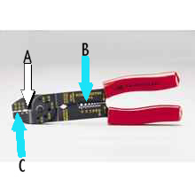 Point A (the white arrow) is used for cutting the wire ends off, just like a pair of pliers. More than likely you will not have to do this, most are pre-cut coming from the manufacturer (On the fan, and on the extension cord). Point B is used for stripping the wire, put the wire end in the proper gauge hole (Marked on the tool), and pull. Point C is used for crimping. In this assembly, I have used wire nuts instead of crimped butt splice connectors.