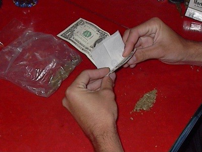 Now you need to close the dollar with your mix inside. Don?t squeeze the product; pinch the dollar right above your Bud/Tobacco mix and While pressing upwards the dollar you want to distribute a firm even press throughout the mix.