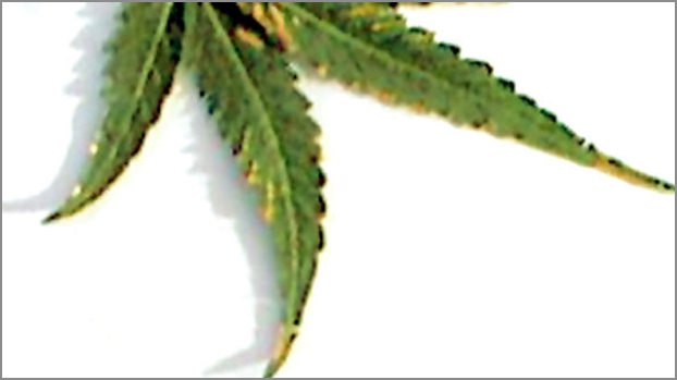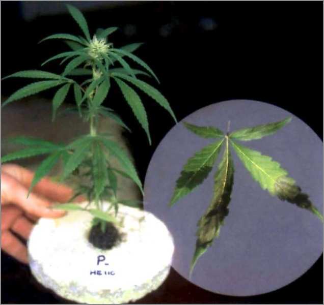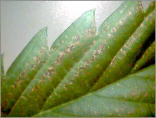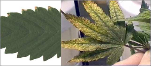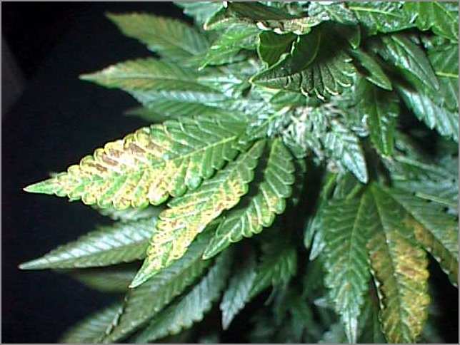 Figure 5 pH Fluctuation: Both of these leaves in figure 6 and figure 7 are from the same plant. It could be over fertilization, but more likely it is due to the pH being off. Too high or too low a pH can lock up nutrients in the form of undisolvable salts and compounds, some of which are actually toxic to the plants. What then happens is the grower then tries to supplement the plants diet by adding more fertilizers, throwing off the pH even more and locking up even more nutrients. This type of problem is seen more often in soil mixes, where inconsistent mixing of the medium’s components leads to “hot” spots.