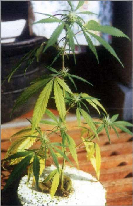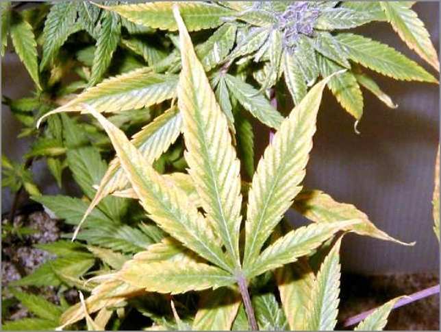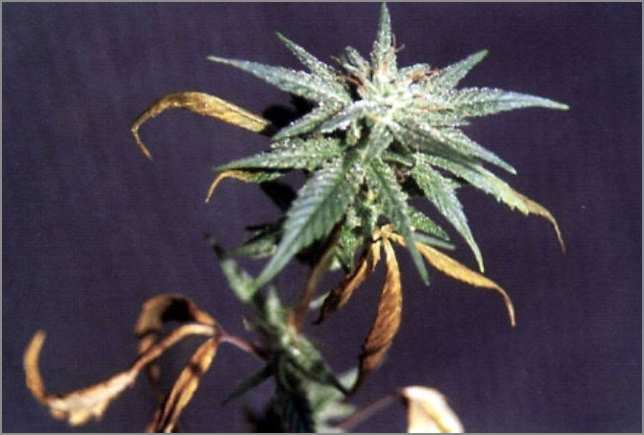 Sulphur (S) deficiency: The initial symptoms are the yellowing of the entire leaf including veins usually starting with the younger leaves. Leaf tips may yellow and curl downward. Sulfur deficiencies are light green fruit or younger leaves with a lack of succulence. Elongated roots and woody stem. Although it’s hard to see in figure 19, the upper stems of this plant are purple. Although many varieties of cannabis do get purplish stems, the trait generally extends the entire length of the plant’s stem, and not just near the top as in this specimen.