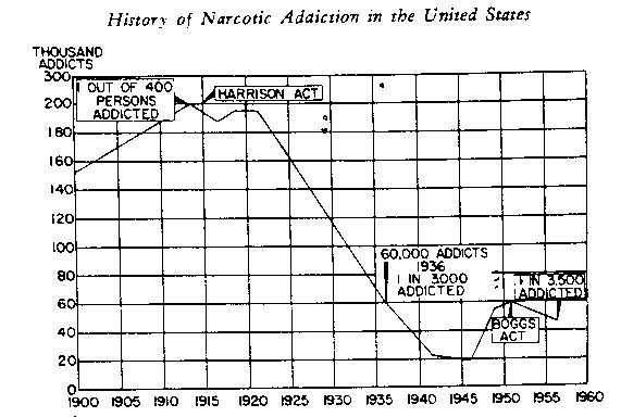 Before the passage of national control legislation fin 19141 there was one addict in every 400 persons in the United States. By World War I this incidence had been reduced to about 1 in every 1,500 persons, and by World War 11 the incidence was found to be roughly 1 in 10,000 rejected for military service because Of addiction. At this time the narcotic traffic in the United Stares was probably at the lowest ebb since the enactment of Federal legislation to control narcotics. Following World War II and the resumption of shipping there has been an influx of heroin from the Middle East and European countries…. The total number of addicts in the United States today is estimated at between 50,000 and 60,000 or an incidence of about 1 in 3,000 of the population.8