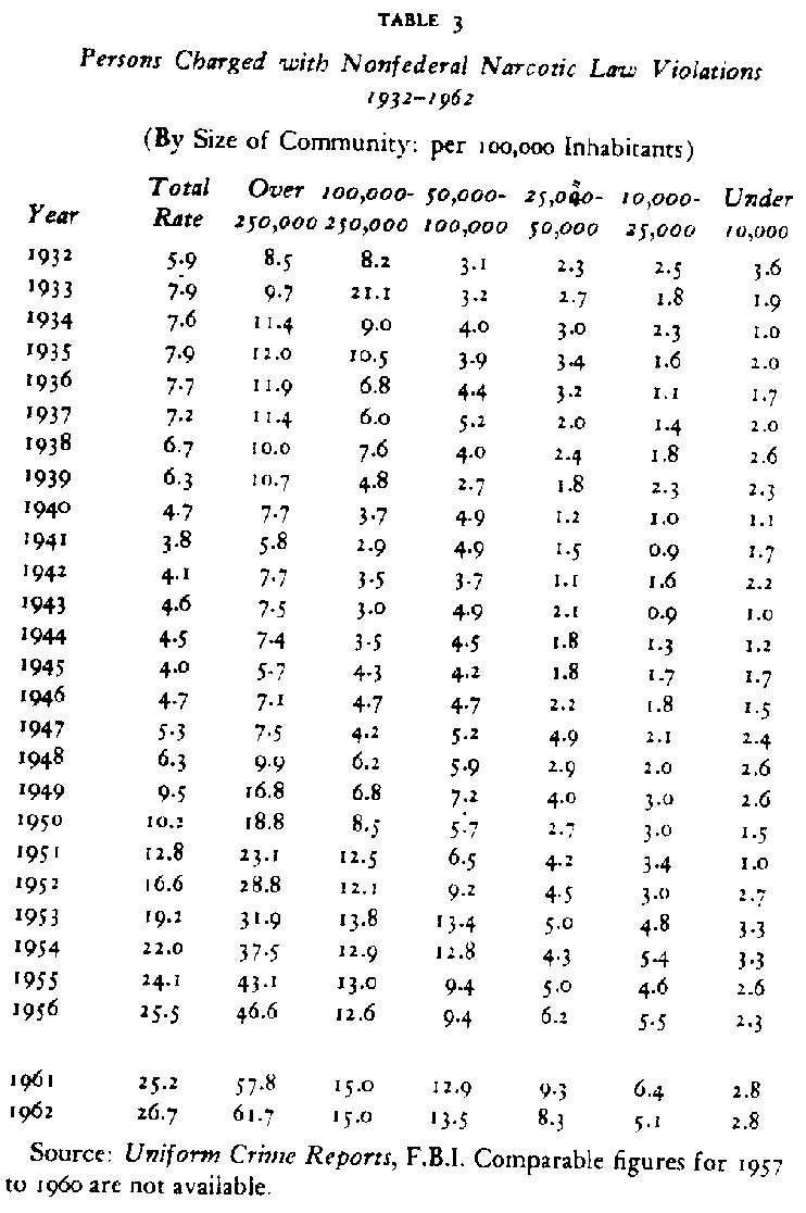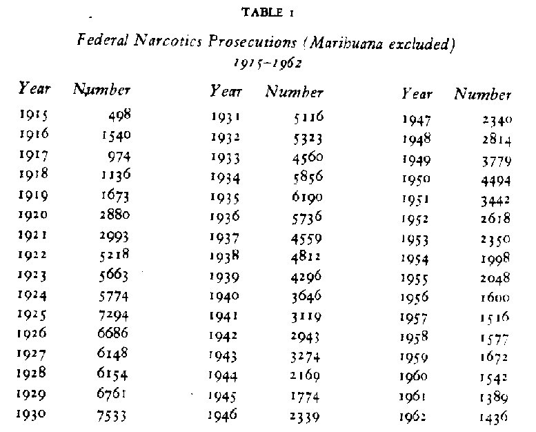 Sources: Annual Reports of the Commissioner of Internal Revenue, 1915-1926; Annual Reports of the Commissioner of Prohibition, 1927-1930 Annual Reports of the Federal Bureau of Narcotics, “Traffic in Opium and Other Dangerous Drugs,” 1931-1962 The description of these totals has varied but they are believed to represent approximately the number of persons charged with criminal violations. Had marihuana cases been included in these figures after 1937, when the marihuana Tax Stamp Act was passed, there would have been no appreciable alteration of the trend, for the number of such cases is small.