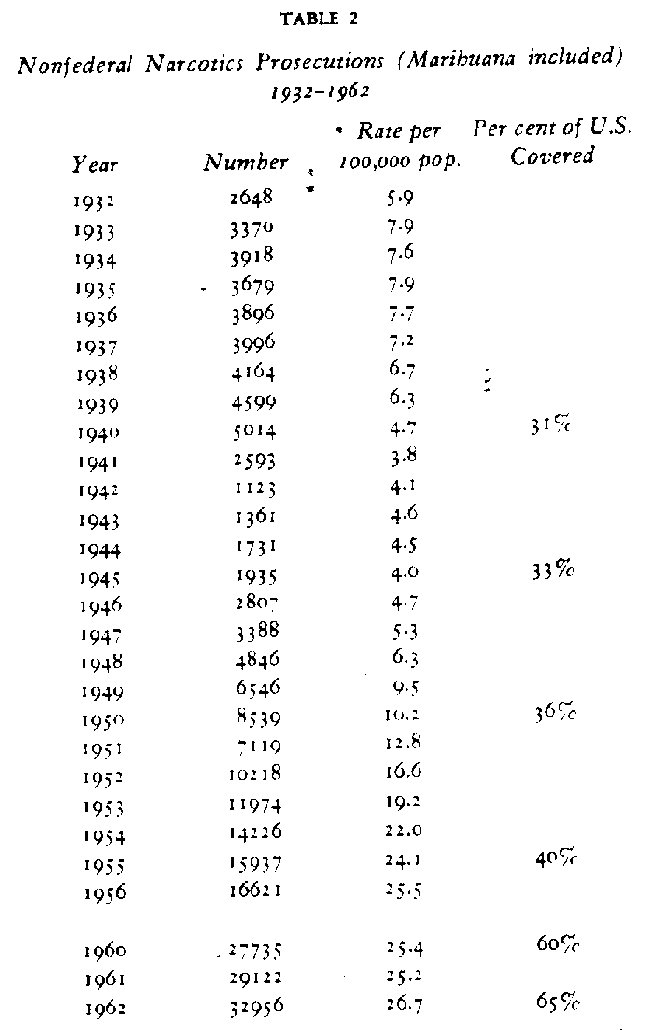 Source: Uniform Crime Reports, Federal Bureau of Investigation, Washington D.C. Comparable figures are not available for 1957 -59 The totals represent “persons held for prosecution.” Various changes in the reporting system and methods of calculation make it extremely hazardous to regard these data as anything more than crude approximations. Reports issued by the F.B.N. indicate that approximately 10 to 15 per cent of these totals are marihuana cases. See Daniel Subcommittee Hearings, Exhibit 8, pp. 272-275.
