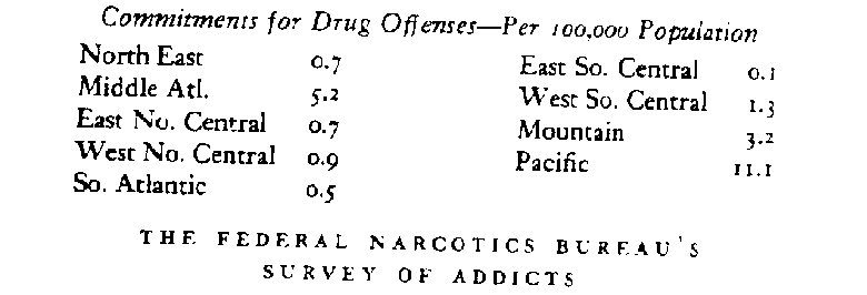 California officials and police officers generally agreed that addiction in that state was probably increasing about as fast as the population. Disregarding the alleged 32,000 legal users, most of whom were probably not addicts (if the figure itself is not in error), it is impossible to take the 60,000 estimate for the nation as a whole seriously in view of reports from individual states and cities. It is of interest to observe that some twenty years earlier in 1931 3 State Narcotic Committee estimated that there were about 3,000 addicts in California.3