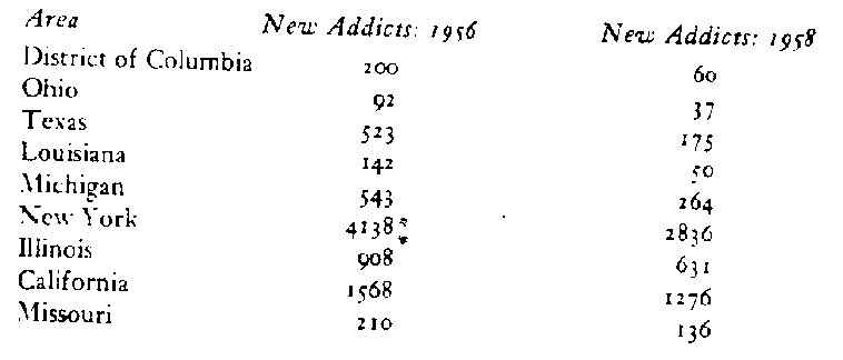 Apart from the fact that if the Bureau’s survey is worth anything at all the number of newly reported addicts should automatically decline, it is also obvious that the above illustrations presented by Mr. Anslinger were selected because they happened to show a decline and that contrary instances were ignored. Using the Bureau’s own figures and selecting states in the same biased manner to present an opposite impression, the following instances may be cited to suggest a great increase in addiction from 1959 to 1960. 19